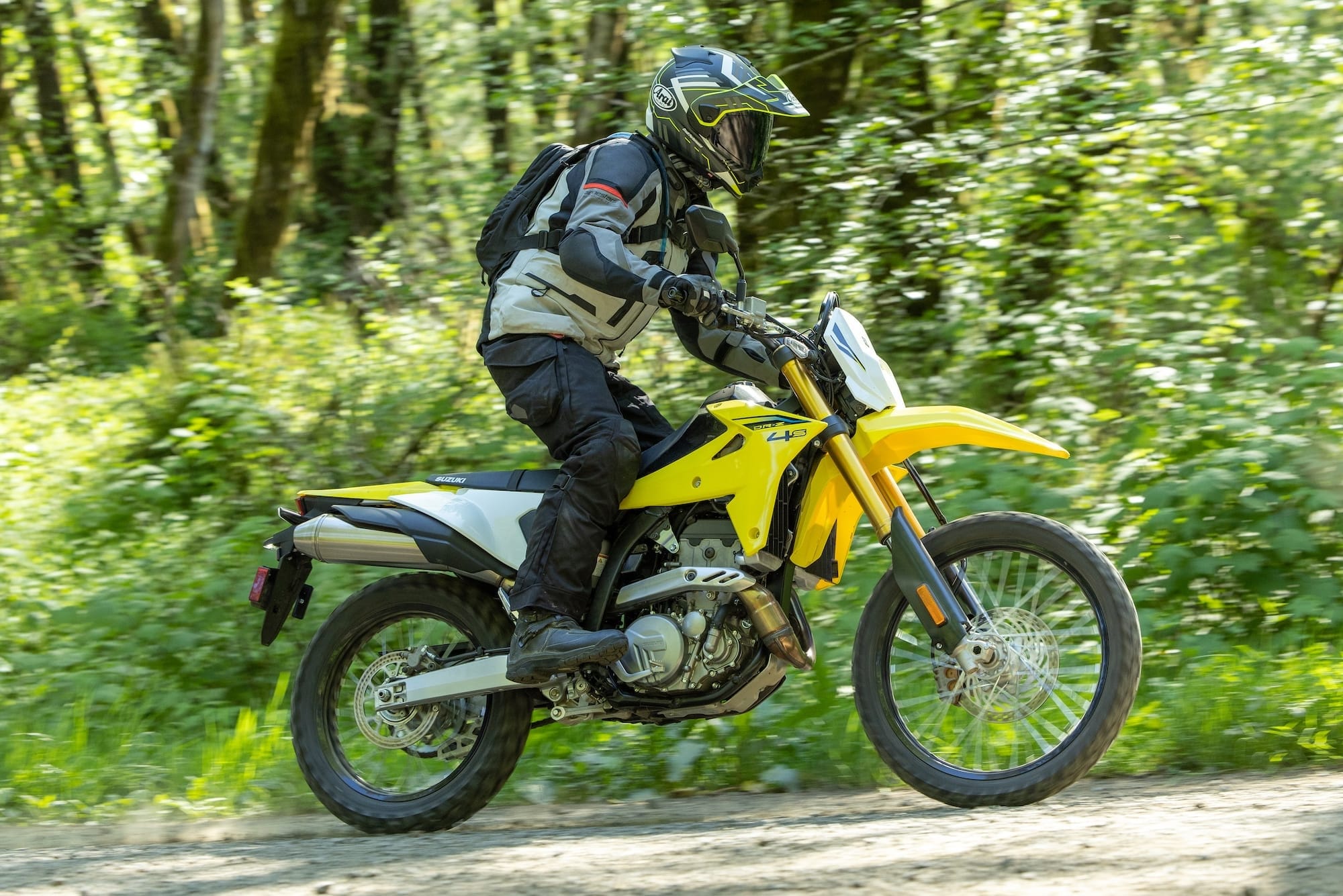 In the dirt, the DR-Z4S is in its element. Ride mode A unleashed precise power for pinpoint drifts. Low-speed tech sections exposed long first and second gears and middling midrange punch. The slick Suzuki gearbox and clutch performed excellently.