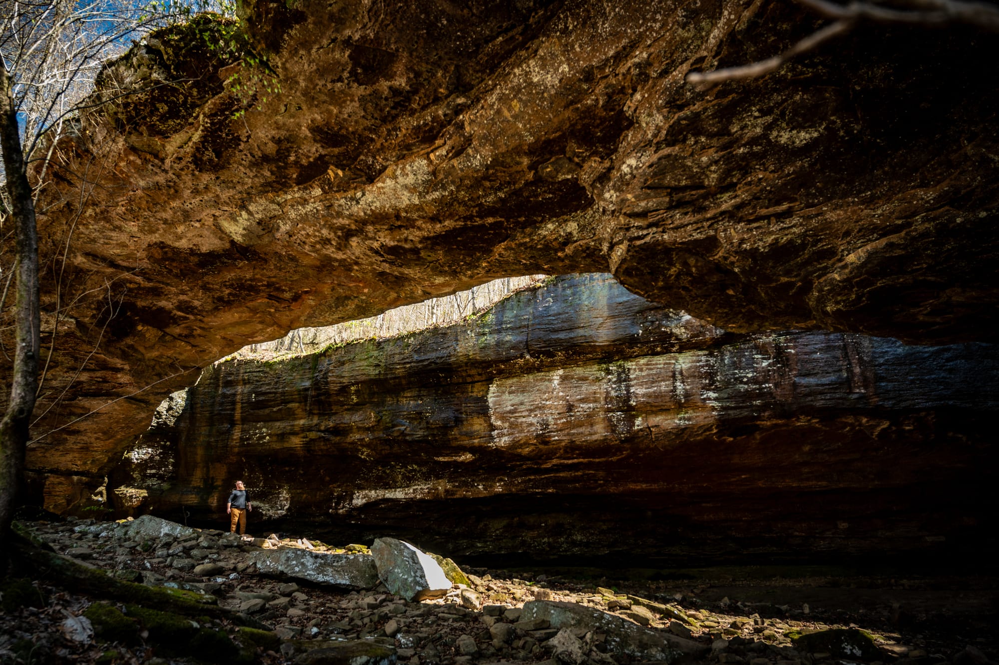 Our thumbs had thawed by the time we rolled into Jasper, a small town surrounded by increasingly windy roads. A few shops were open, so we meandered for a bit before having lunch at the Ozark Cafe, which is famous for its cheese volcano burger.