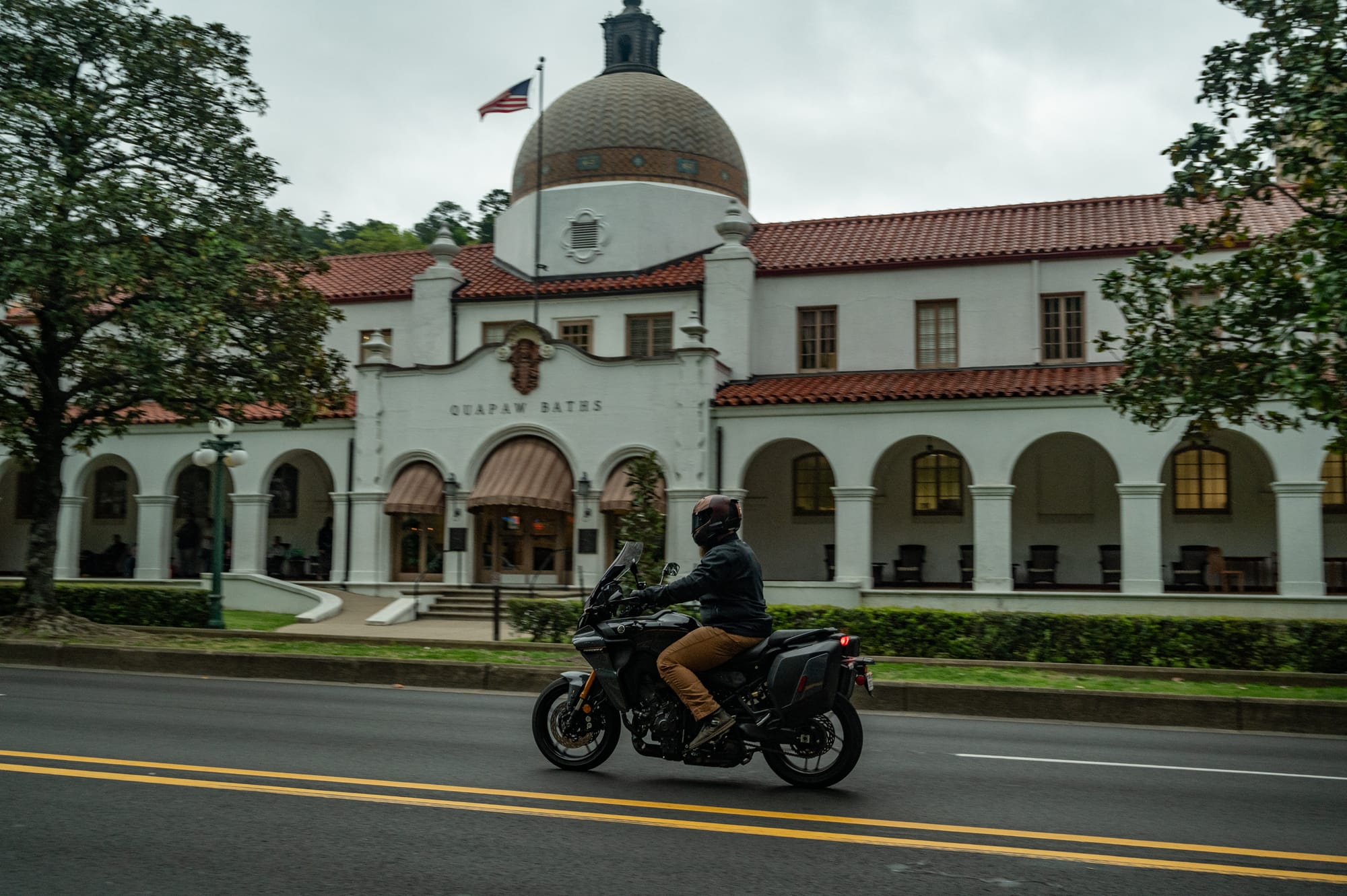 We followed the ever-twisty SR 103 south out of Oark before cutting across to SR 7, which runs straight south until you reach Hot Springs. This route was so scenic, we wouldn’t mind riding a part of it again the next morning. Once in Hot Springs we decided to go take a dip in the, er… Hot springs. However, the thousands of other visitors in town had the same idea and there was no availability at the bathhouse. Bummed that the town didn’t quite live up to its name, we decided to walk the main strip, check out the shops, and find some food.