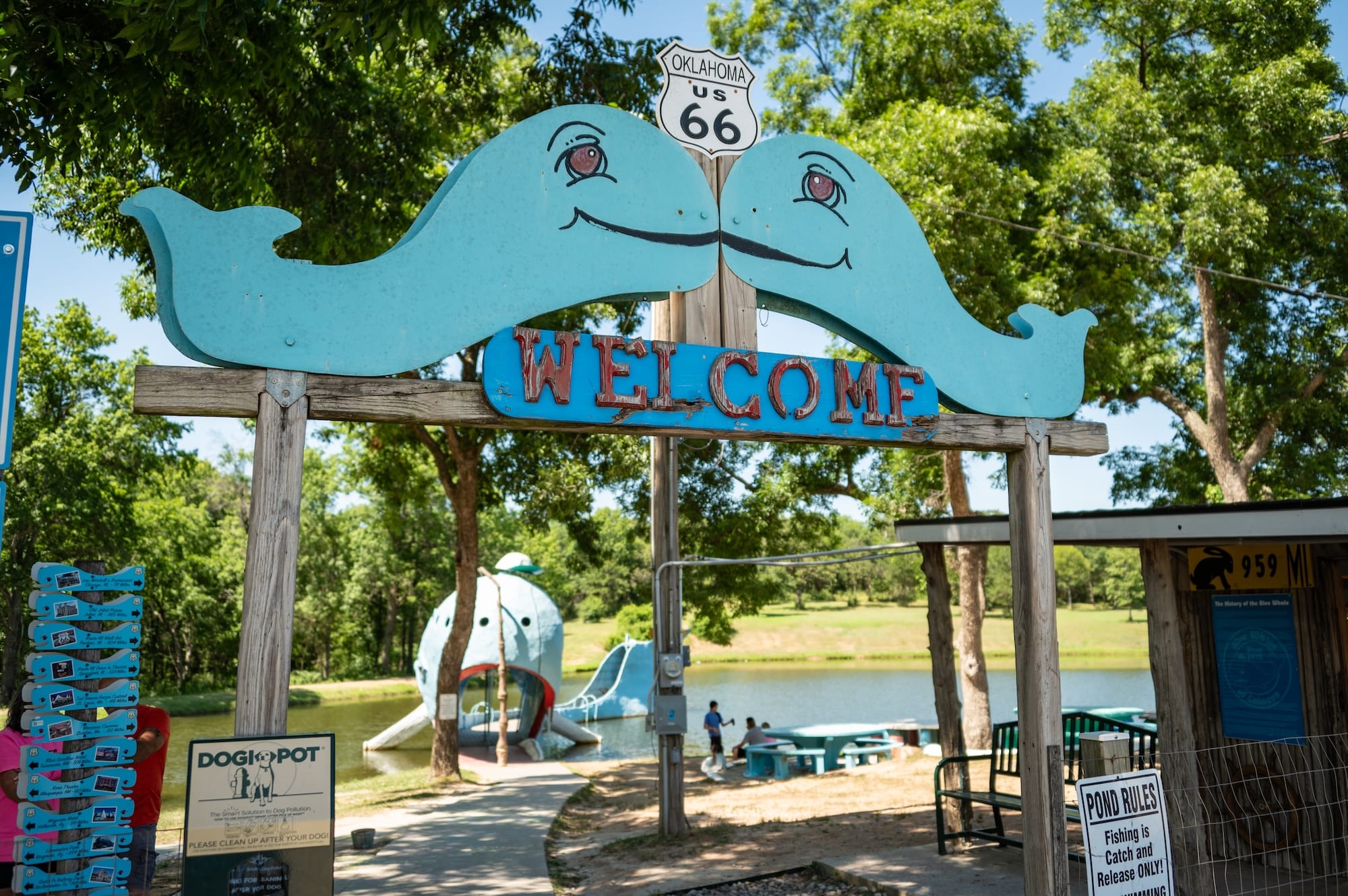 What started as a private sculpture quickly became a local gathering spot, with families swimming, picnicking, and enjoying impromptu celebrations around the pond. Over the years, the Blue Whale grew into a symbol of Route 66 kitsch, capturing the imagination of travelers with its cheerful smile, towering tail, and friendly, photogenic presence.