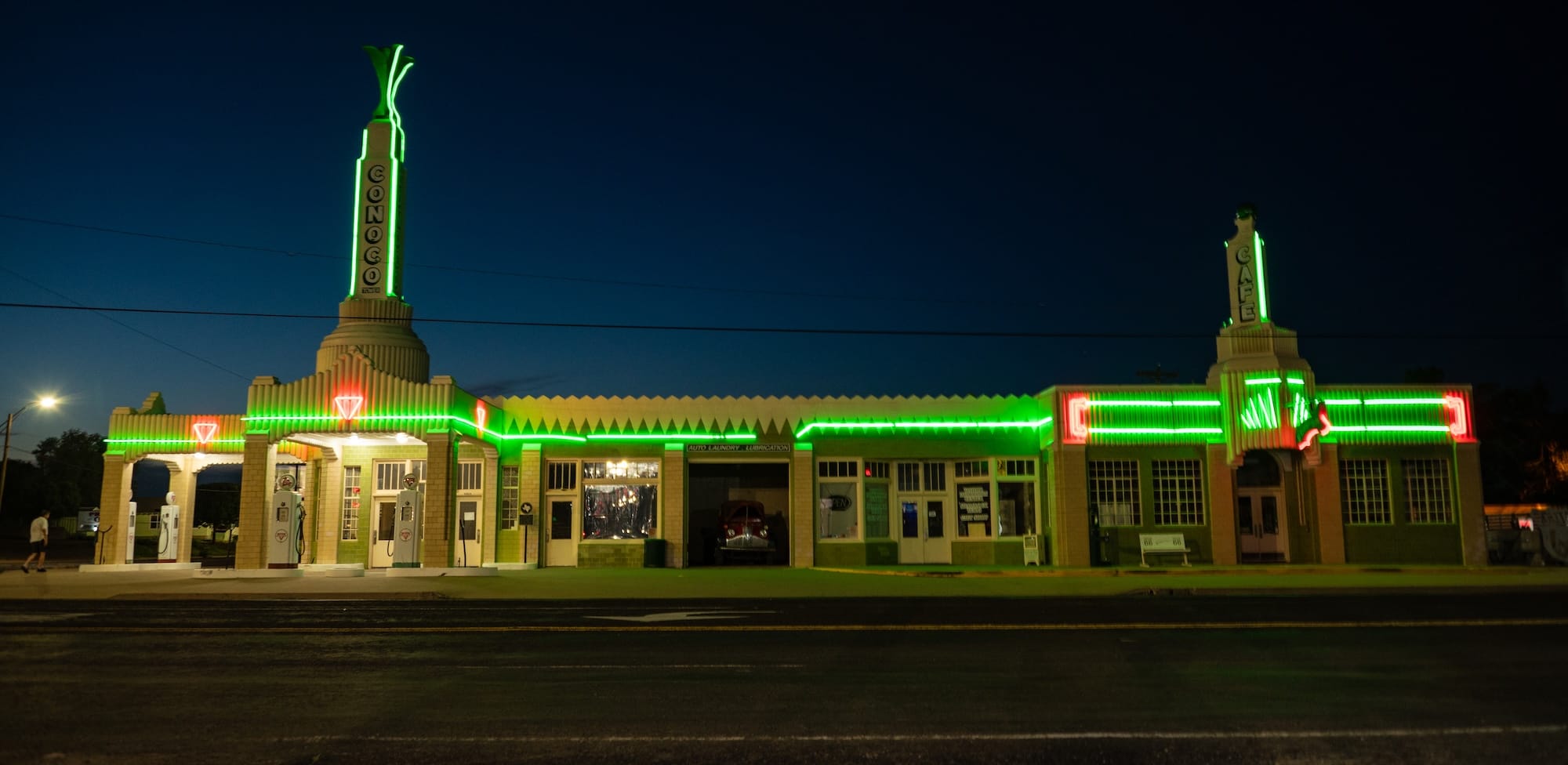 The Conoco Tower Station, also known as the U-Drop Inn, is one of Route 66’s most iconic stops. Built in 1936, this art deco structure served as a gas station on one side and a cafe on the other, immediately becoming a hub for travelers.