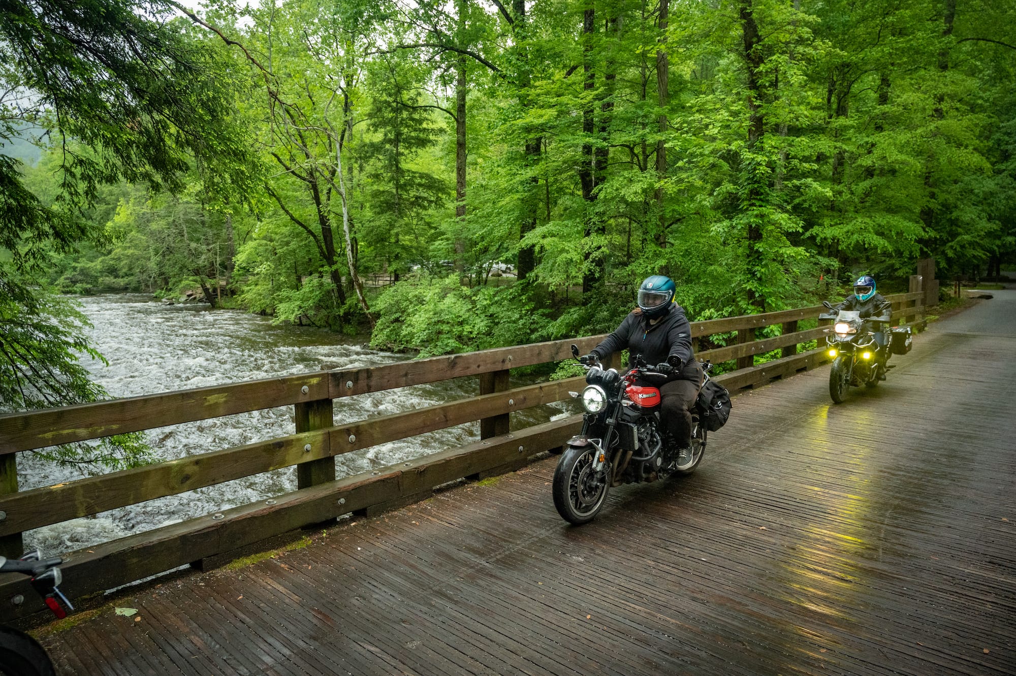 As we made our way up Newfound Gap, the fog thickened and a light rain spattered our faceshields. The roads were slick and we gently rolled through each corner, wishing we could see more than 50 yards ahead of us. Yet, we were thankful for being able to keep forward momentum up with light traffic. Our only slowdown was to carefully pass a female elk on the side of the road. Even though we missed the views we were hoping for, the ride into Gatlinburg was beautiful. The road glistened with moisture, and the forest was vibrantly green, thanks to all the new vegetation the rain had saturated.