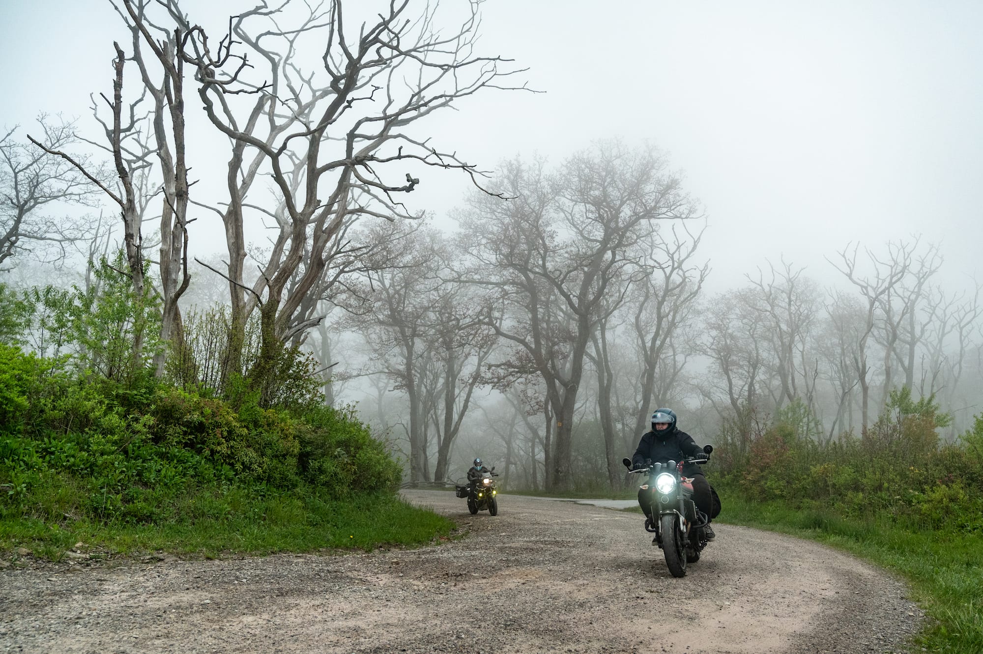 We followed US 64 north, until we reached Wayah Rd, one of my favorites. The switchback corners here are exhilarating and the pavement is generally in very good shape. We opted for another short 4.4-mile gravel detour and headed toward Wayah Bald, ending up in the clouds once again. Many of the trees at the top are dead from a forest fire and they looked like something out of a Halloween movie when swallowed by the low fog.