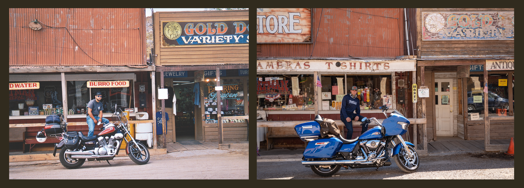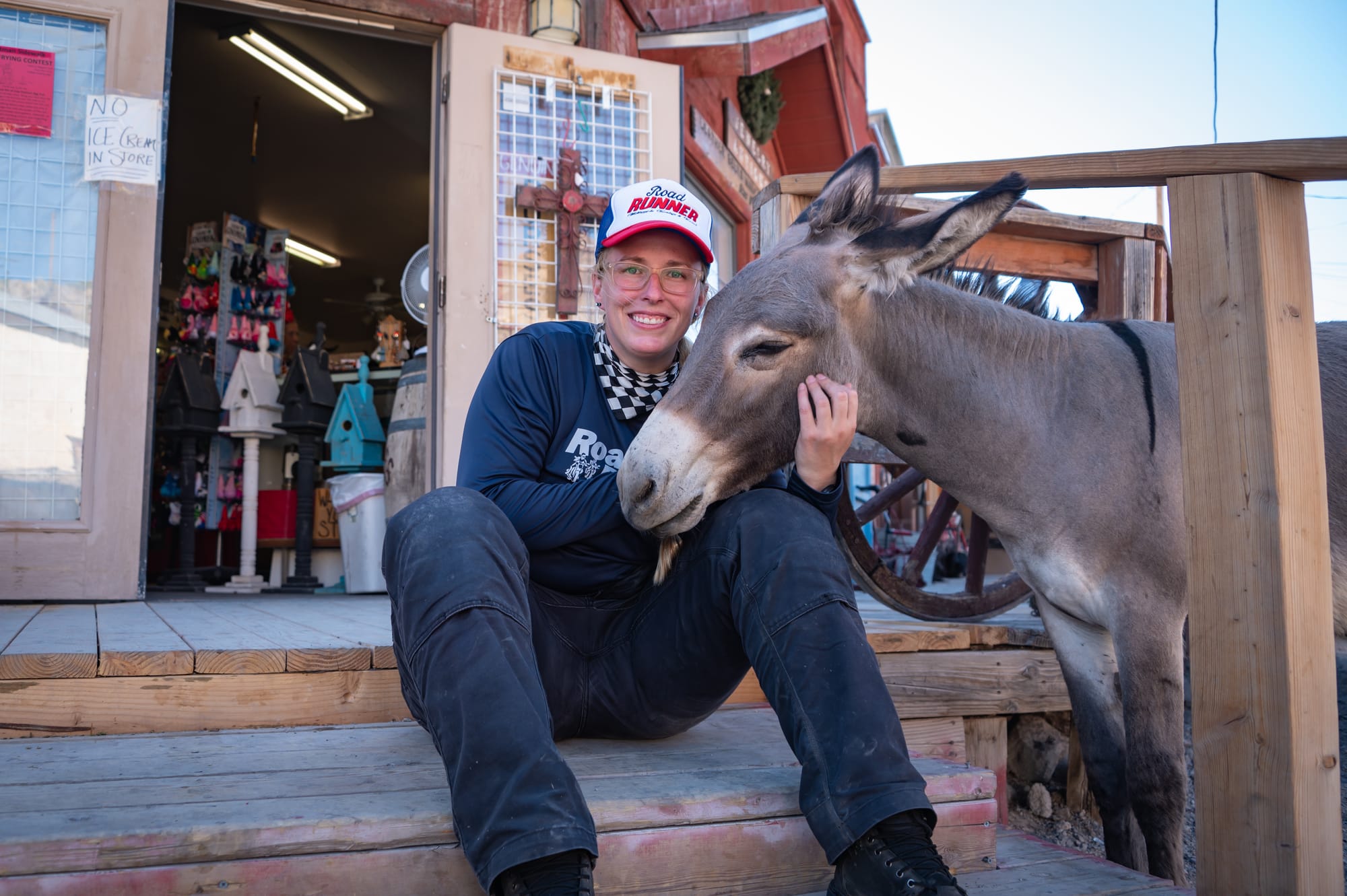 You might wonder just how “wild” these donkeys really are. They've grown quite accustomed to humans, often lingering near shops hoping for a treat or a scratch behind the ear. Locals not only recognize each of the regulars, but many know them by name and personality, treating them more like town mascots than wildlife. We lingered for a while, sipping fresh-squeezed lemonade, feeding the burros, and browsing a few of the quirky antique shops. To our delight, some of them featured vintage motorcycles among their dusty treasures.