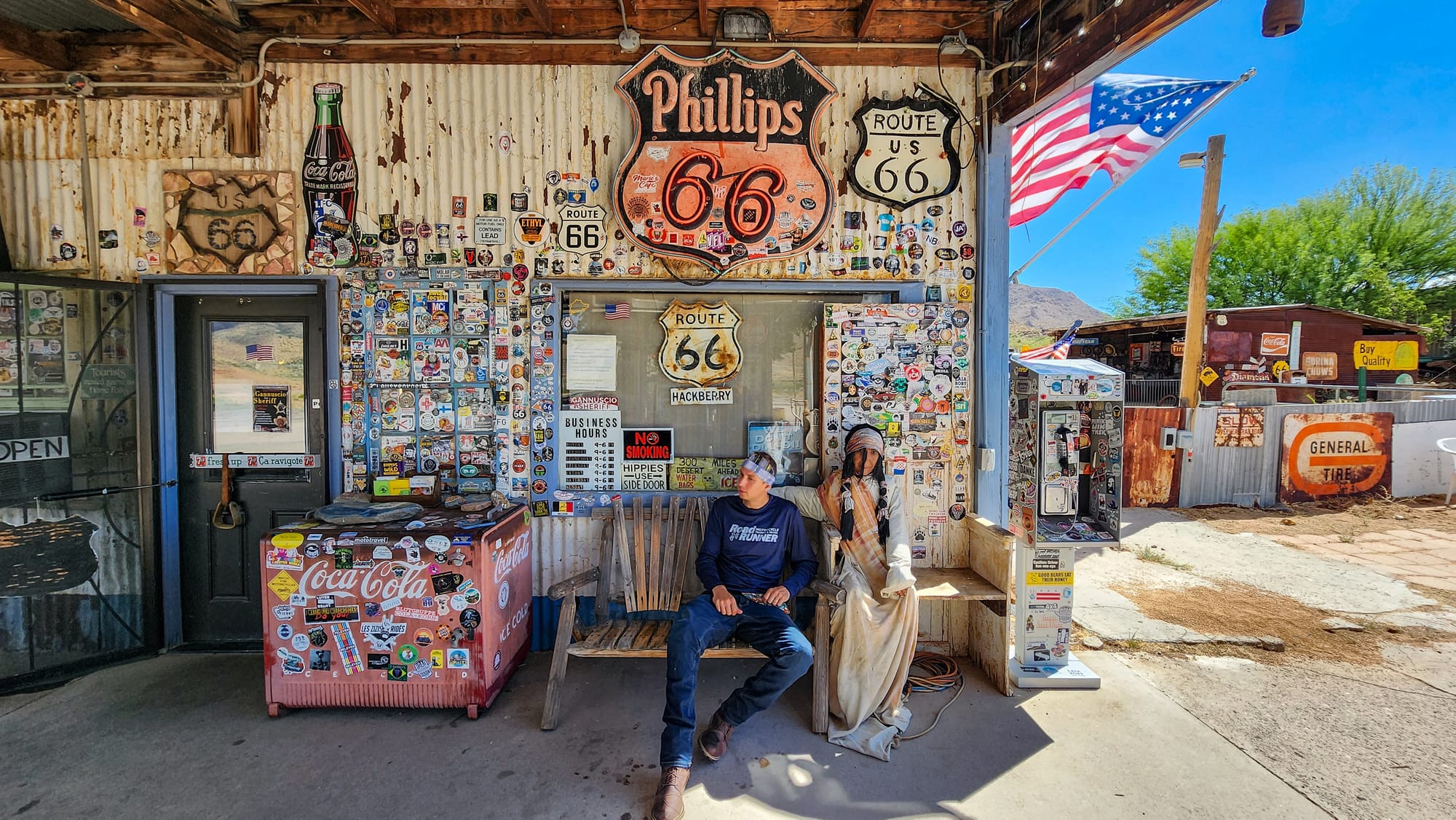 This gas station not only had cold drinks and fuel, but also an attached post office. We grabbed a spot at the picnic table and took a few minutes to scribe messages on the backs of postcards we’d picked up a few days earlier. There was something timeless about pausing to put pen to paper. In the golden age of Route 66, a handwritten postcard was the heartbeat of roadside communication. I can only imagine how many of those little cards were sent from the Mother Road during its prime. The number must be staggering—millions of tiny stories sent off to faraway mailboxes.