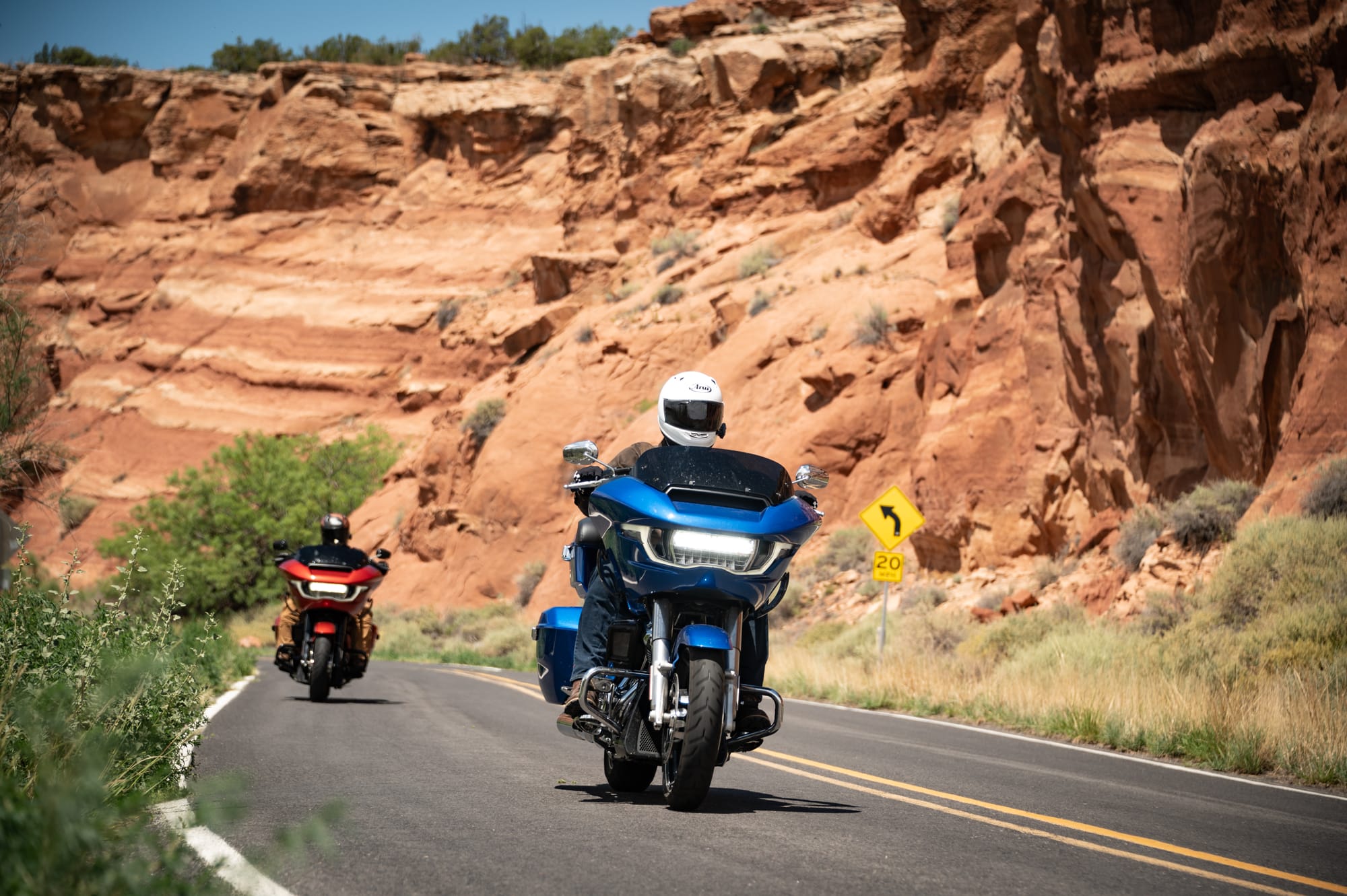 Out of nowhere, in the middle of the corner during one of the photo passes, Caleb’s bike gave out. Dead Man’s Corner lived up to its name, but this time it was the machine that didn’t make it. We concluded it must have been struck by a spirit arrow, fired not in anger but to force us to stop in the middle of the desert for some unknown reason.